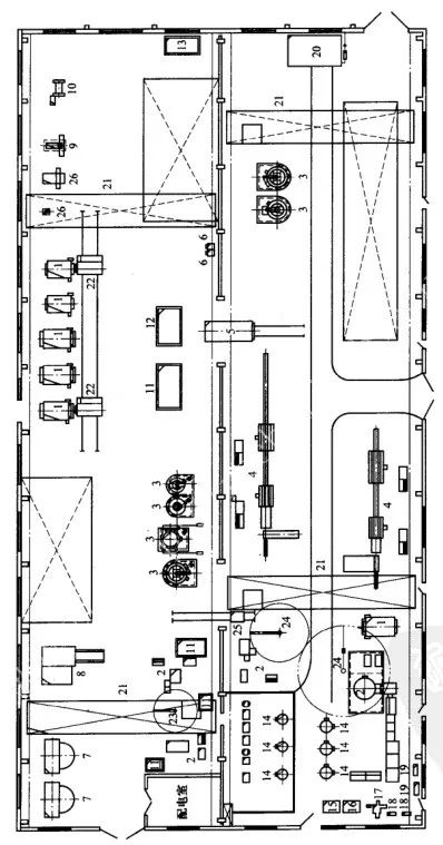 1一箱式電阻爐 2一停火機床 3一井式回火電阻爐 4一中額摔火回火自動線 5一臺車式電阻爐 6-實驗電阻爐 7一描丸機 8-清淀機 9一校直機10一摩擦壓力機 11一水檀 12-癢火池糖 13一循環水槽 14一中頓感應加熱裝置15-體火水槽 16一冷卻水槽 17一工具模床 18一砂輪機19-電焊機 20-油槽 21一橋式起重機 22一旅拉料小車 23一播臂吊架 24一平衡吊 25一平板車 26-硬度計1-上下料臺 2一多用爐 3一箱式間火爐 4一清洗機 5一運料小車 6一淬火機床 7一高頻加熱裝置 8一低溫冰箱 9一真空粹火爐 10一干燥箱11一輝光離子濾氨爐 12一機床 13一橋式起重機 14一校直機 15一井式回火電爐 16一冷卻水槽 17一拋丸機 18一懸骨起重機19-磁粉探傷機 20一鹽浴爐 21-確鹽爐 22一淋火精 23一箱式電照爐 24一臺車式電肌爐
