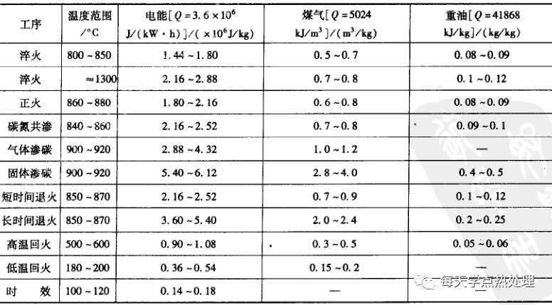 移動式用電設備,應注明其工作區域及供電方式(如滑觸線或電纜)。電動葫蘆、梁式和門式起機及電動平板車,應在工藝平面布置圖上,標出滑觸線起止位置和電纜供電點位置。一般用電設備或只帶一般降壓用變壓器的設備,如以電動機為動力的設備及電阻爐等,安裝以kW為單位;帶專用變壓器的設備,如高頻電源、磁粉探傷機等,安裝容量以kVA為單位。當設備需要的電源不是一般常用的交流、380V、50Hz時,應在設備明細表的技術規格欄中注明。存放易燃、可燃或易爆物質的場所及存在易燃易爆的氣體或大量粉塵的場地,應注明儲存物品的名稱、數量或氣體(粉塵)的成分和含量。當工作場地存在腐蝕性氣體、蒸汽或特別潮濕時,以及存在高溫、強烈振動或輻射時,應予注明。熱處理車間工藝設計人員僅需提出車間的照明要求和照明區域等資料,由電氣專業設計人員依據車間特性和照明面積進行計算和設計,統籌考慮工作地的照明、局部照明和事故照明等。熱處理車間用電設備電能耗量的計算方法有:按設備負荷時數計算和按產量計算。由于按設備負荷時數法計算耗電量困難較多,且誤差較大,一般按單位產品產量的耗電指標計算。粗略計算時,可依單位質量工件耗電量指標和車間生產量計算。表24為各熱處理工序加熱1kg金屬所需電能、煤氣、重油概略指標。▼表24 各種熱處理工序加熱1kg金屬所需能源消耗指標