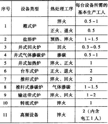 (1) 生產工人是指直接從事熱處理工藝及設備操作的工人。(2) 輔助工人是指生產工人以外,直接為熱處理生產服務的工人,如熱處理件準備工、電工、鉗工、儀表工、起重運輸工等。(5) 服務人員是指服務于生產和職工生活福利的人員,如清潔工等。