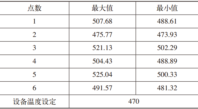 按圖3放置測點對熱處理爐爐內溫場進行檢測,爐溫設定為470℃,保溫70min,記錄各個測點溫度變化情況,檢測結果見表1。