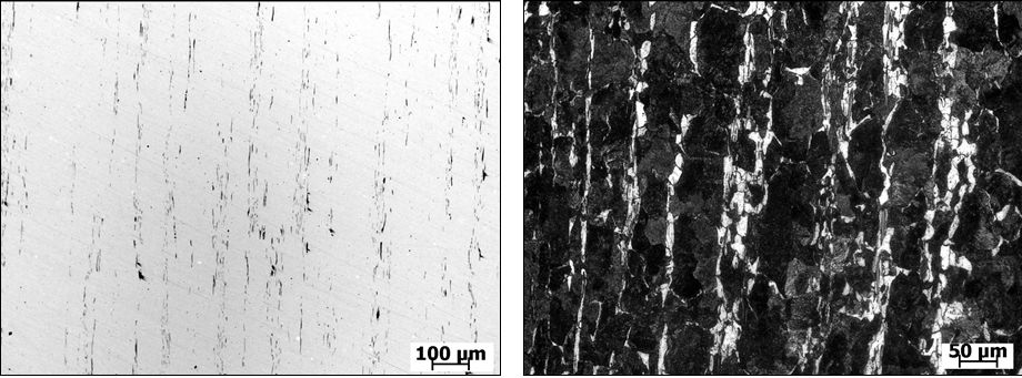 斷裂U形件非金屬夾雜物含量較高,這與化學(xué)成分分析結(jié)果中較高的S含量相吻合。大量的硫化物夾雜沿鐵素體與珠光體界面析出,割裂了基體的連續(xù)性,導(dǎo)致材料沿垂直于加工方向的力學(xué)性能嚴(yán)重降低。通過對斷口邊緣取樣金相檢驗也發(fā)現(xiàn),斷面主要沿夾雜物與基體的交界面擴(kuò)展,表明該部件的斷裂與大量非金屬夾雜物的存在有較大關(guān)系。