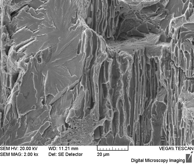 (2)化學(xué)成分分析 表1為斷裂件取樣的化學(xué)成分分析結(jié)果。該斷裂件各化學(xué)元素含量與ASME SA-29規(guī)定的4340鋼元素含量差異較大,且S含量顯著高于標(biāo)準(zhǔn)要求。經(jīng)與ASME SA-29比對發(fā)現(xiàn),斷裂件化學(xué)成分與該標(biāo)準(zhǔn)牌號為1345的鋼種較為接近。可見,設(shè)備供應(yīng)商提供的材料牌號與實際牌號不符,可能存在材質(zhì)錯用的情形。