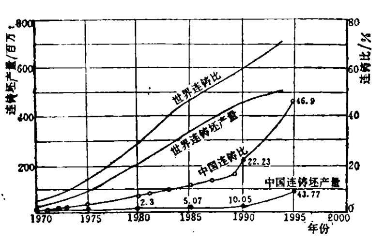 連續鑄造(Continuous Casting)技術發展已經有100多年的歷史。連鑄技術的出現是現代冶金技術的一次重大革命,連鑄取代模鑄,使大規模鋼鐵生產才有了可能性。 概括起來,連鑄技術的發展大致可分為以下五個階段: 連續澆鑄金屬液思想的啟蒙階段 1840年塞勒斯獲得了連續鑄鉛專利 1856年貝塞麥采用水冷旋轉雙輥連鑄機澆鑄出了金屬錫箔、鉛板和玻璃板,并獲專利 最早(1887年)提出與現代連鑄機相似的連鑄設備建議的是德國人戴倫,在其開發的設備中已包括了上下敞開的結晶器、液態金屬注入、二次冷卻段、引錠桿和鑄坯切割裝置等。 鋼的連續鑄造特征技術的開發階段 40年代開始連續鑄鋼的試驗。1943年瓊.漢斯在德國建成了第一臺澆鑄鋼液的試驗連鑄機。 瓊.漢斯試驗連鑄機專利原理圖 當時提出的振動水冷結晶器、浸入式水口、結晶器保護劑等技術觀點為現代連鑄機奠定了基礎。結晶器振動已成為連鑄機的標準操作。 常規連鑄技術工業化應用、成熟階段 在這個時期,連鑄技術以驚人的速度向前發展,出現了5000多個有關連鑄的專利、技術,奠定了現代連鑄技術基礎。 1950年 瓊漢斯開發了鑄坯電磁攪拌技術 1952年 薩伯爾獲得了弧型鑄機專利 1953年 最早的運動會就是古希臘的古代奧運會,運動會中每人都能展現自德國曼內斯曼公司開發了結晶器電磁攪拌技術 1954年 德國曼內斯曼公司開發了中包塞棒控制技術 1961年 康卡斯特公司開發出立彎板坯連鑄機 1962年 康卡斯特公司獲得鋼包回轉臺專利;法國東方優質鋼公司和德國曼內斯曼公司開始使用保護渣保護澆鑄 1964年 英國巴洛光亮鋼有限公司研制成功了中間包塞棒自動控制系統 1965年 美國人奧爾森提出了漸進彎曲矯直技術,德國曼內斯曼公司采用浸入式水口澆鑄技術 1966年 德國曼內斯曼公司采用了鋼包注流保護技術和多輥驅動的矯直機 1967年 德國曼內斯曼公司試驗壓縮澆鑄方法 1968年 加拿大阿爾果馬鋼公司建成了工字型坯連鑄機 1969年 德國曼內斯曼公司進行了120°平角噴嘴( 水)試驗 1974年 德國曼內斯曼公司采用了氣水霧化噴嘴 1976年 德國曼內斯曼公司開發成功支撐輥對中、 彎曲及軸承阻力等多功能輥縫檢測裝置;日本川崎制鋼開發成功結晶器在線無級調寬技術 代表性技術 50年代:第一代工業連續鑄鋼機投入生產 50年代是連續鑄鋼取得突破性進展10年。1950年世界第一臺工業生產用立式連鑄機在聯邦德國曼內斯曼公司的胡立根廠投產。隨后,不同國家的15臺(40流)工業性鑄機相繼投產。中國于1954年開始連鑄試驗,1957年上海鋼鐵公司中心試驗室首先建成了一臺工業規模的立式試驗機組。1958年北京鋼鐵學院徐寶隆教授設計的我國第一臺工業生產用的矩形坯連鑄機在重鋼三廠建成。 較有影響的連鑄新技術有: 1954年,Halliday將其“負滑脫原理”用于連鑄,真正解決了坯殼與結晶器壁相粘結的問題,同年還出現銅板組合結晶器以及鍍Cr的銅管結晶器; 1957年,γ射線傳感器用于自動控制結晶器液面; 1958年,意大利的一臺 8流方坯連鑄結晶器上第一次采用正弦波方式振動; 1959年,挪威的一臺方坯鑄機上第一次采用保護渣保護結晶器液面。50年代已試澆過不銹鋼、硅鋼、高速鋼鋼軌鋼、軸承鋼、工具鋼、沸騰鋼等鋼種以及小斷面圓鋼和H型鋼; 50年代以前的幾十年間,世界都在探索嘗試各種凝固形式的連鑄,如輥式,履帶式,到達50年代才確立了銅結晶器為凝固裝置的連鑄技術。確立了立式連鑄機,立彎式連鑄機的核心地位。 60年代:弧形結晶器連鑄和寬板坯鑄機大發展 由于立式鑄機(包括立彎式鑄機)高度較高,廠房投資費用較大,弧形連鑄機的出現解決了這個問題, 并大大促進了現有鋼廠建設連鑄機。 1952年,最早提出弧形結晶器專利的是O.Schaaber,而后,1956年E.Sch.等以及1960年中國徐寶隆教授也都獨立地提出或設計了弧形結晶器連鑄機。 1963年, 由 O.Schaaber設計、聯邦德國曼內斯曼公司制造的第一臺弧形結晶器方坯連鑄機在德國建成投產,接著瑞士、中國等3個國家的九臺(13流)方坯和板坯弧形結晶器鑄機相繼建成投產。但是,真正投入工業性三班連續生產的第一臺弧形鑄機是1964年由O.Schaaber設計的奧地利的一臺150mmx600mm的連鑄機,第二臺投入工業生產的是重鋼三廠180mmx1700mm的弧形板坯鑄機。 我國第一臺工業生產連鑄機 60年代開發的連鑄技術有: 1961年,鑄坯帶液芯彎曲技術用于寬板坯連鑄機; 1964年,德國在一臺鑄機上開發了直筒形浸入式水口加保護渣澆注的技術 其后,連鑄工作者又將美國在宇航中開發的熔融石英技術用于連鑄,從而制造了帶側孔的浸入式口,用其澆注寬板坯解決表面縱裂間題。 1967年,為進一步降低鑄機高度,在德國建造了兩臺超低頭板坯連鑄機,在Uss/Gary廠一臺板坯連鑄機集中了中間包滑動水口、自動開澆和結晶器液面控制、帶液芯彎曲矯直。 此外,如液壓驅動的結晶器振動、液壓剪切機、中間包加熱等技術也得到開發,美國人奧爾森提出了漸進彎曲矯直技術,德國曼內斯曼公司采用浸入式水口澆鑄技術。還出現了全連鑄鋼廠以及工字梁用異形坯鑄機。 70年代:石油危機促進連鑄高速發展 連鑄工序的能耗僅為模鑄一初軋工序的10%左右,因此,70年代的兩次全球性石油危機加速了連鑄的發展。 20世紀世界粗鋼產量的變化情況 這一時期出現的連鑄新技術有:結晶器液面自動控制、多孔浸入式水口、多段式結晶