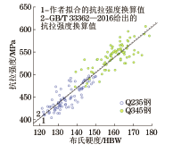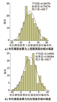由硬度推算抗拉強度,目前可以依據的國內標準主要有GB/T 33362—2016《金屬材料 硬度值的換算》和GB/T 1172—1999《黑色金屬硬度及強度換算值》。GB/T 33362—2016使用翻譯法等同采用ISO 18265:2013《金屬材料 硬度值換算》(英文版),該標準中表A.1給出的非合金鋼、低合金鋼與鑄鋼硬度換算表,是由德國冶金工程師協會在多個不同試驗室中使用經檢驗和校準的硬度計進行比對試驗得出的。GB/T 1172—1999是由中國計量科學研究院等多家研究機構經過大量試驗研究得出的,標準中的表2給出了主要適用于低碳鋼的換算關系。但這兩個標準都沒有給出換算值不確定度的具有統計意義的可靠數據,對于換算結果的偏差范圍無從得知。