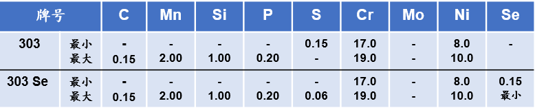303Se(UNS S30323)添加了硒而不是硫,與303相比,冷成形和熱成形性能提高,且機加工表面更光滑,機加工速率也略有降低。