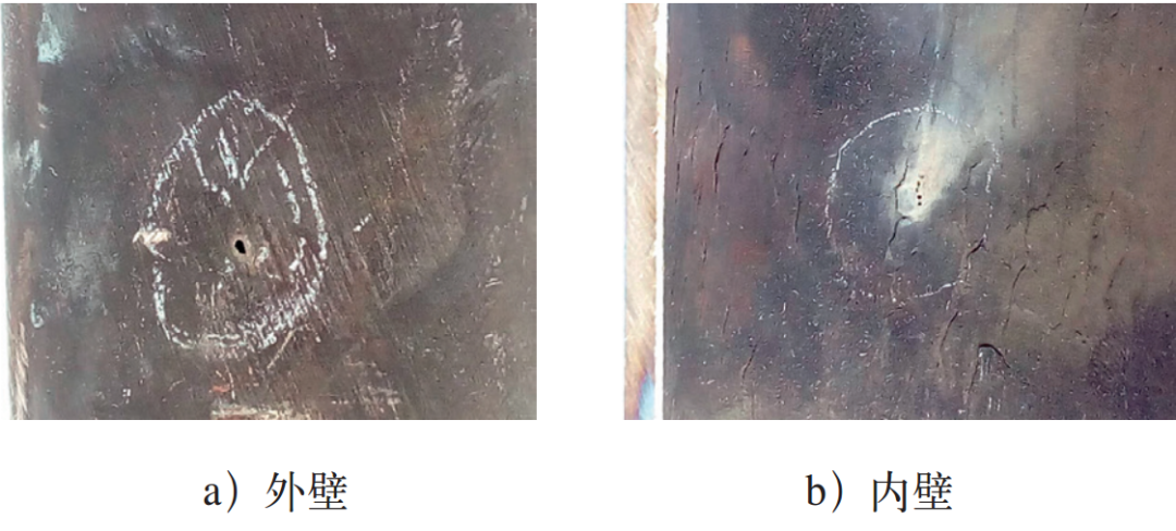 316L屬于奧氏體不銹鋼,對應(yīng)國內(nèi)牌號為022Cr17Ni12Mo2,具有良好的塑性和耐蝕性,該不銹鋼中添加的Mo元素極大地提高了其抗點蝕能力。因此,316L不銹鋼被廣泛應(yīng)用于石化、醫(yī)藥等行業(yè)。某企業(yè)使用的316L不銹鋼盤管在使用過程中發(fā)現(xiàn)管壁泄漏穿孔現(xiàn)象。管內(nèi)工作介質(zhì)為水蒸汽,工作壓力0.9MPa,管外介質(zhì)為強堿、銅粉,工作壓力1.0MPa,內(nèi)外壁存在壓力差。筆者對其失效原因進(jìn)行了試驗分析和研究。從外部宏觀目視檢查發(fā)現(xiàn),泄漏孔在外壁顯示為一個直徑約2mm的小孔,如圖1a所示。在內(nèi)壁顯示為4個直徑約為1mm的縱向排列小孔,并可見大量“翹皮”狀裂紋,如圖1b所示。