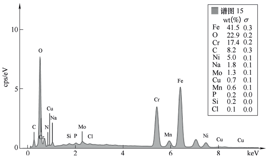 對圖7a陳舊斷口取樣進(jìn)行能譜分析,如圖8所示,結(jié)果見表4,腐蝕產(chǎn)物較為復(fù)雜,主要成分為氧化物,還夾雜有Cu、Na等。