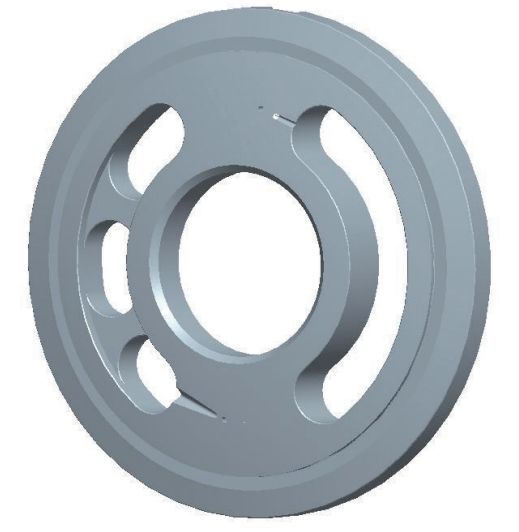 配油盤(見圖1)是液壓泵總成中的一個重要零件,與轉子組件組成液壓泵中的關鍵摩擦副。該配油盤材質為38CrMoAl,加工工藝流程為:鍛造→正火→調質→車銑加工→滲氮→磨削。其中調質技術要求為:調質硬度30~36HRC,金相組織按GB/T 11354—2005要求為1~2級;滲氮技術要求為:表面硬度≥900HV10,滲氮硬化層深度0.2~0.4mm,滲氮層脆性、疏松、氮化物均為1~2級合格。