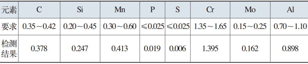使用直讀式光譜儀對零件進行化學成分分析,該零件設計材質為38CrMoAl,實測結果見表1。表1 配油盤化學成分(質量分數) (%)