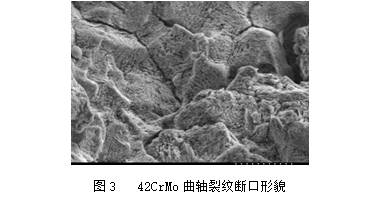 圖2a為曲軸裂紋前端的微觀形貌。可以看到裂紋表面較寬,內部較窄,這說明裂紋從表面向內部擴展,擴展過程中裂紋無分枝,裂紋兩側不存在脫碳,組織為回火索氏體。圖2b為曲軸裂紋附近金相,為4.0級均勻回火索氏體;奧氏體晶粒度為6.5級;滿足曲軸技術條件。