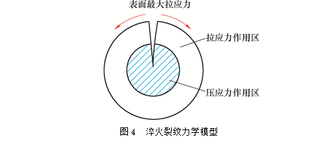 該曲軸裂紋為典型的淬火裂紋中的縱裂,縱裂通常是在工件完全淬透,由組織應力造成。縱裂形成的應力-力學條件是在零件表面上的最大拉應力超過材料的斷裂強度,縱裂產生的力學模型與組織應力的原因一致,即:在淬火冷卻初期,零件表層比心部先轉變成馬氏體,隨后零件心部馬氏體相變是在外層馬氏體限制下進行的,而馬氏體相變會發生體積膨脹,于是心部金屬給外層金屬擴張作用,在外表面引起最大拉應力,如前所述,組織應力的切向應力顯著大于軸向應力,當這一應力超過材料的斷裂強度便會發生縱裂。力學模型見圖4。由于部分曲軸小頭表面存在鍛造傷,使小頭部位產生應力集中,增大了組織應力,促進了縱裂的產生;而較高的碳含量和較高的合金元素含量也增加淬裂的傾向。