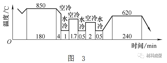 采用水空交替淬火,用清水替代價格昂貴的淬火油,尤其對大型零件,減少一次投入更有實際意義。對環境無污染,屬于綠色熱處理工藝,水空交替淬火后零件組織和力學性能都優于淬油后零件。工藝的難度在于水空交替淬火的時間控制。基于以上原因我們進行了幾次工藝試驗最終取得成功。具體工藝如圖3所示。現已批量生產300多根,質量穩定,工藝試驗成功。