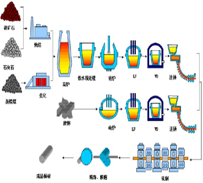 電爐流程:電爐(20t->100t)+爐外精煉[ LF+VD(RH)]+連鑄(小方坯、大方坯、大圓坯)+軋制