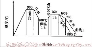 為了避免出現帶狀組織,采用了兩相區處理,具體工藝曲線如圖5。首先高溫奧氏體化,然后,空冷到Ac1稍下(700℃)保溫,使過冷奧氏體分解為珠光體組織。然后再緩慢升溫到兩相區760℃保溫,得到奧氏體+鐵素體兩相。