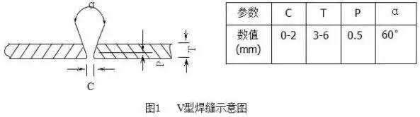 由于薄壁管道的管徑較大,管壁較薄,坡口的大小及平直度不易把握。選用LG-400-2型的等離子切割機(jī),切割后坡口用V型坡口(如圖1),對(duì)切割好的管口進(jìn)行打磨,打磨出30°斜角。