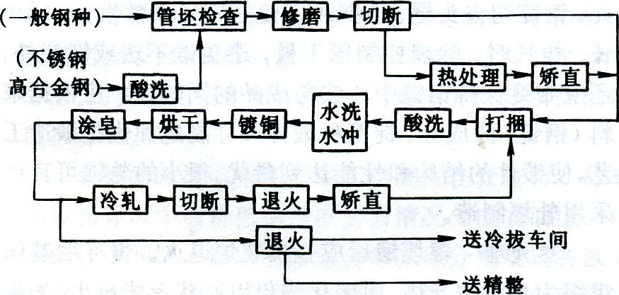 冷加工管機組生產(chǎn)特點是管料從投入到加工成成品通常要經(jīng)過多次冷變形并產(chǎn)生加工硬化,因而整個生產(chǎn)過程由多個準備工序和變形工序組成,且具有往復(fù)循環(huán)的特點,因而工序多,生產(chǎn)周期長、金屬消耗較大,生產(chǎn)效率較低,一般生產(chǎn)規(guī)模均不大。冷軋和冷拔鋼管的生產(chǎn)工藝流程如圖1、2。