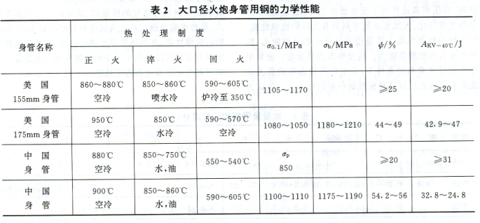 厚壁大口徑火炮身管用鋼具有高橫向比例極限一。、或高屈服強(qiáng)度吼。和良好的低溫韌性(見表2)。為保證這些性能,在熱處理工藝中,美國(guó)175mm身管用鋼和中國(guó)相應(yīng)的身管用鋼都采用高溫正火加低溫淬火加回火的熱處理工藝,使鋼的成分和組織均勻化,進(jìn)一步細(xì)化晶粒,以獲得良好的綜合力學(xué)性能。表2大口徑火炮身管用鋼的力學(xué)性能。
