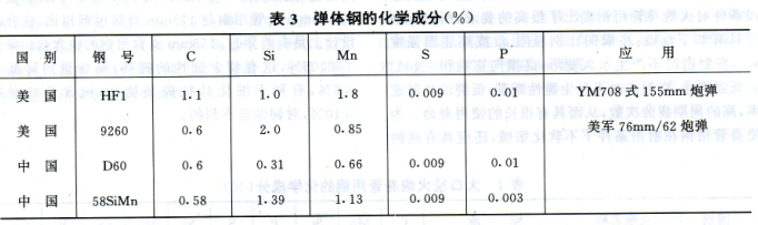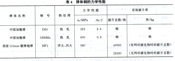 炮彈彈體用鋼 為保證炮彈具有很大的殺傷威力,因此炮彈彈體用鋼,通常都采用高強(qiáng)度、低韌性的鋼。在合金設(shè)計(jì)中,通常都采用高碳、高錳、高硅和其他脆性元素,使鋼中碳化物數(shù)量增加、回火脆性傾向增大、奧氏體晶粒粗大化,以保證彈體鋼具有很高的破片率,從而增大殺傷威力。彈體鋼的化學(xué)成分示于表3,力學(xué)性能示于表4。