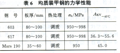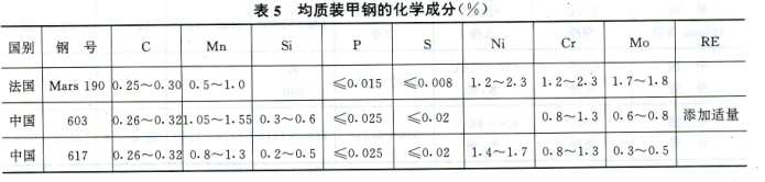 均質(zhì)裝甲鋼 在戰(zhàn)爭(zhēng)中裝甲鋼將受到不同距離、口徑、速度的各種彈丸的沖擊與爆炸物的轟擊,瞬間承受巨大的動(dòng)能、破片、沖擊波和聚能效應(yīng),使裝甲鋼在高溫、高壓和高速作用下發(fā)生塑性變形、破裂、甚至部分熔化或氣化。因此要求裝甲鋼具有良好的抗彈性能。裝甲鋼的抗彈性能主要是指其抗彈丸的侵徹能力、抗沖擊能力和抗崩落能力。抗侵徹能力是指在一定裝甲厚度和彈丸著角的條件下,裝甲鋼不被擊穿的最大動(dòng)能彈著速或能抵御某種標(biāo)準(zhǔn)破甲彈的能力。一般認(rèn)為它隨著裝甲材料的硬度和彈性模量的提高而提高。抗沖能力是指在彈丸的高速?zèng)_擊下,裝甲不發(fā)生開裂和崩落等損傷的能力。它與材料的韌性和強(qiáng)度有關(guān)。所以要求裝甲鋼具有良好的抗侵徹、抗沖擊和抗崩落等能力,即要求裝甲鋼應(yīng)具有高強(qiáng)度和良好的韌性,以提高鋼的抗彈性能。在制造裝甲車輛的過程中,還要求裝甲鋼具有良好的冷熱加工性能和焊接性能。典型的均質(zhì)裝甲鋼的化學(xué)成分和力學(xué)性能列于表5和表6。