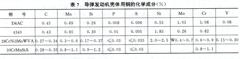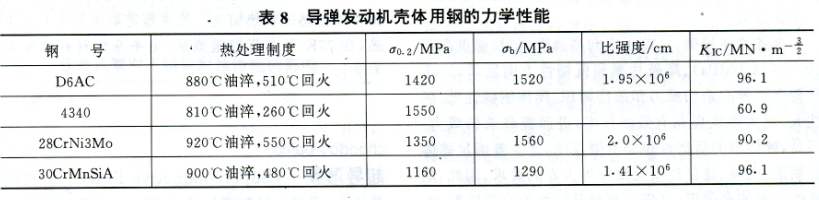 導(dǎo)彈發(fā)動(dòng)機(jī)殼體用鋼 為減輕導(dǎo)彈彈體的重量,要求殼體用鋼應(yīng)具有高的比強(qiáng)度,以增大火箭的推力;為防止低應(yīng)力破壞,要求殼體用鋼應(yīng)具有高的斷裂韌性;為降低制造成本,要求殼體用鋼應(yīng)具有良好的加工性能和焊接性能。