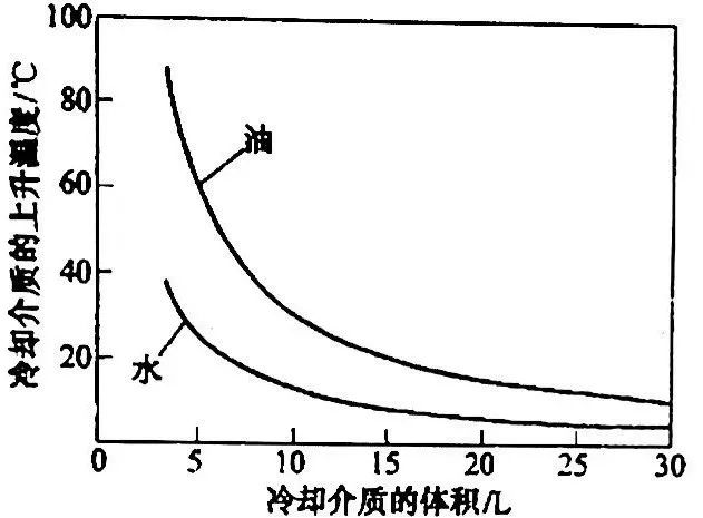 ▲圖1 1kg鋼自850℃冷卻到100℃時,冷卻介質體積與溫升的關系
