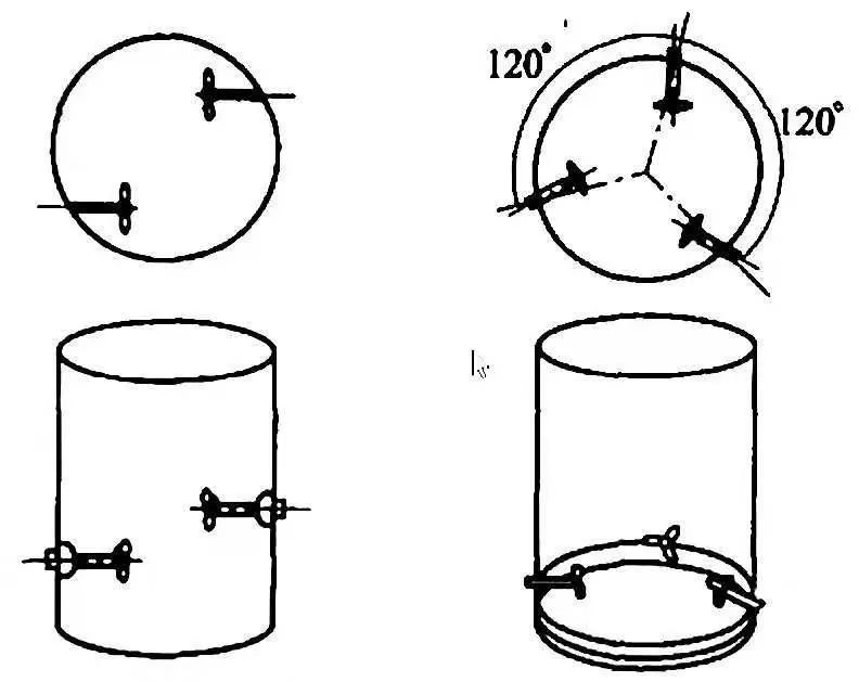 對于圓形淬火槽,當攪拌功率超過2.2kw時,就可以考慮設置多個攪拌器。如果功率在2.2~4.5kw之間,攪拌器可以考慮側插或頂插安裝。如果功率超過7.5kw就要安裝兩個以上攪拌器。具體安裝攪拌器的數量還應考慮是否有足夠的安裝空間。圖11 所示為圓形淬火槽側插式攪拌器的安裝示意圖。