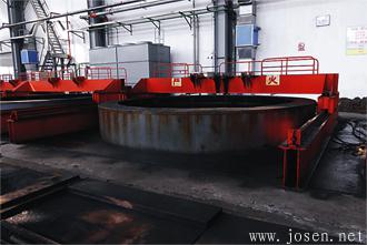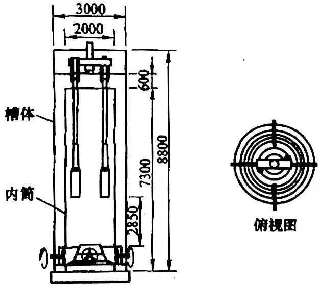 深井式淬火槽常用于長軸類工件淬火冷卻。圖24 所示為頂插攪拌器的深井式淬火槽。淬火槽直徑為?2.2m,深度為7m,配置兩套螺旋槳攪拌器,為了減少裝液量,導流筒置于槽體之外。對于深度小于10m以下的淬火槽的攪拌,可以考慮采用頂插式螺旋槳方式攪拌;大于該尺寸,可以考慮采用側插式螺旋槳攪拌或泵攪拌。
