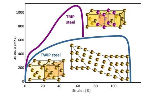 高強度IF鋼,TRIP鋼和TWIP的應變硬化行為對比。
