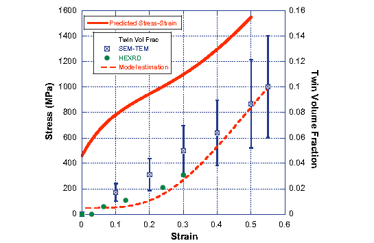 圖8 TWIP鋼實驗室測得的和預測的孿晶體積占比的演變(右側Y軸)和預測的應力-應變曲線(左側Y軸)(Fe–17.5 wt.% Mn–1.4 wt.% Al–0.56 wt.% C)