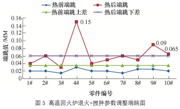 調(diào)整攪拌后,零件熱處理前后端跳測(cè)量結(jié)果如圖4所示,可知,零件使用調(diào)整淬火攪拌參數(shù)后的平均熱變形端跳量為0.057mm,小于使用原淬火攪拌參數(shù)的平均熱變形端跳量0.085mm。但是其大部分熱后端跳值超出工藝要求上差,其熱后端跳值標(biāo)準(zhǔn)偏差為0.015。