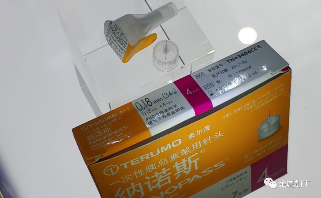 在2019年11月的第二屆中國國際進口博覽會上,展示了一根直徑0.18毫米、長3毫米的針頭,需要顯微鏡才能看清它的真面目。這根胰島素注射針頭名是“NANOPASS Jr.”(納諾斯Jr.),來自日本泰爾茂株式會社,早在2005年泰爾茂公司就開發出了33G(直徑0.2mm)的皮下注射用針頭。這根號稱史上最細最短胰島素注射針頭,針尖部分的結構還做了特別優化,能讓打針的痛感降到最低。