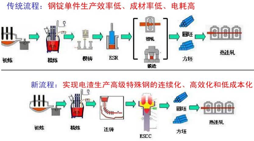 為解決電渣重熔技術電耗較高、批量少管理不便、生產效率低等局限性特點,冶金工作者也在不斷的創新和完善電渣重熔技術,如電渣連鑄技術: