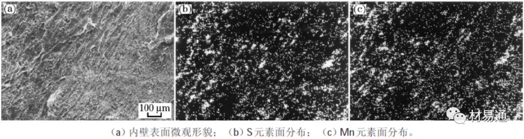 圖7 鼓包內(nèi)壁表面微觀形貌及其Mn、S元素面分布圖