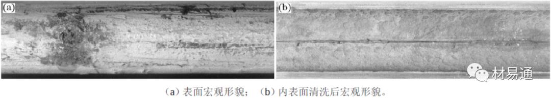失效實(shí)例:供暖水管過(guò)早泄露,材質(zhì)為Q235B碳素結(jié)構(gòu)鋼。圖5(a)為泄露水管宏觀形貌,在泄露點(diǎn)附近水管表面已發(fā)生銹蝕。清除氧化腐蝕產(chǎn)物后,可以看到泄露點(diǎn)所在部位焊縫存在明顯溝槽,如圖5(b)所示。經(jīng)過(guò)對(duì)送檢泄露水管和原始水管進(jìn)行金相、夾雜物、能譜及模擬加速腐蝕試驗(yàn)等綜合分析后得出,焊縫部位存在與內(nèi)表面貫通的氧化物夾雜或復(fù)合氧化物夾雜是水管發(fā)生局部腐蝕、形成腐蝕溝槽并導(dǎo)致過(guò)早泄露的主要原因。在管內(nèi)含有O2、S、Cl 等腐蝕性介質(zhì)作用下,非金屬夾雜將和與之毗鄰的金屬鐵構(gòu)成腐蝕電池發(fā)生電化學(xué)腐蝕導(dǎo)致最終水管泄露。