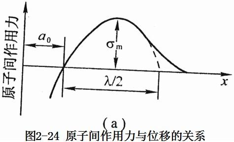 設想完整的晶體材料被解理面分開成兩半晶體,其解理面的晶面間距為a0, 沿拉力方向發生相對位移x, 當位移很大時,位移和作用力的關系并不是線性關系。而原子間的相互作用力最初是隨x的增大而增大,但達到一峰值σm后就逐漸下降,見圖2-24。