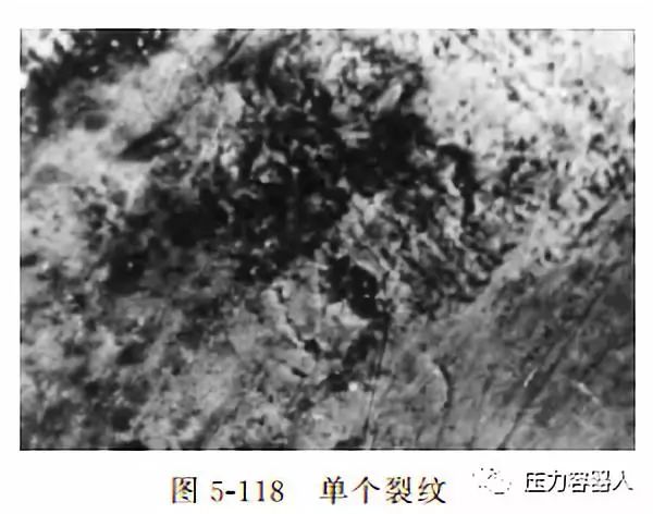 但表面膜與基體的結合力很低, 用HNO3 +HF 混合液清洗3~4min 后, 即成塊脫落。電鏡觀察發現表面膜呈現有龜裂泥狀花樣、凹坑、溝槽或單個裂紋,見圖5-116~圖5-118。