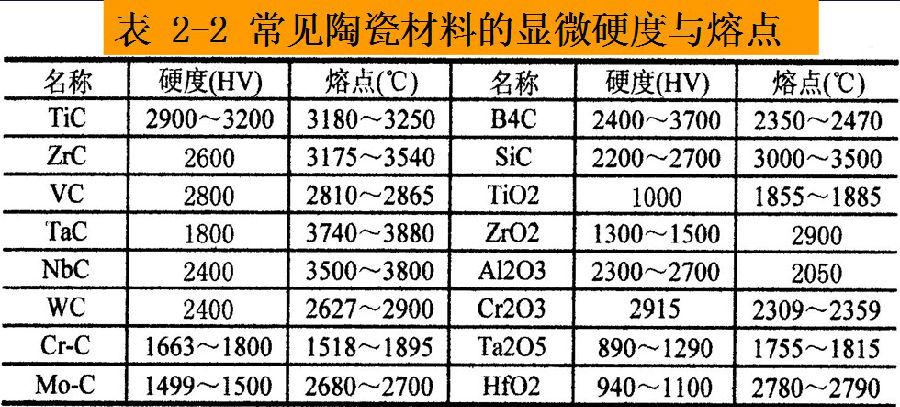 由于顯微硬度的壓痕小,故被測材料要做成金相試樣。因此,它適合于陶瓷材料的硬度測定,見表2-2。