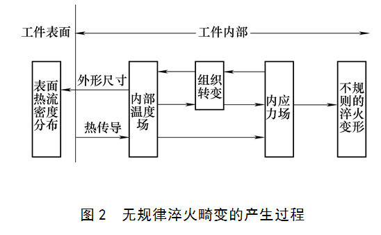 由于零件的應(yīng)力變化較為復(fù)雜,畸變機(jī)理相當(dāng)復(fù)雜。零件在加熱和冷卻過程中,截面受熱和降溫的不同步而形成溫度梯度(或稱溫度場(chǎng)),產(chǎn)生組織應(yīng)力和熱應(yīng)力(或稱內(nèi)應(yīng)力場(chǎng))。應(yīng)力的疊加常常超過零件的屈服強(qiáng)度,使零件永久畸變;淬火前機(jī)加工產(chǎn)生的殘余應(yīng)力,在加熱過程中應(yīng)力的松弛也能導(dǎo)致零件的畸變;零件設(shè)計(jì)結(jié)構(gòu)的復(fù)雜程度不對(duì)稱、厚薄不均勻、組織不均勻等,都能引起畸變,無規(guī)律淬火畸變的產(chǎn)生過程如圖2所示。