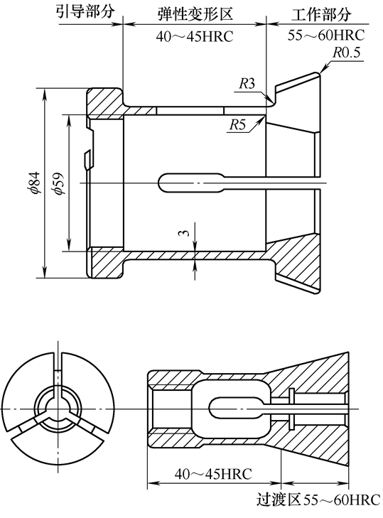 某自動車上使用的彈簧夾頭如圖3所示,材質為60Si2Mn,此材料硬度在40~45HRC時有很好的彈性,硬度>55HRC時有良好的耐磨性。因此,將夾頭柄部的硬度定為40~45HRC,夾頭硬度定為55~60HRC是比較切合實際的。通過淬火+低溫回火,可以保證工件整體硬度≥56HRC,然后再在硝鹽中高溫局部快速回火??焖倩鼗饡r要注意對過渡區的控制,通過專用夾具,保證夾頭過渡區下部10mm浸在硝鹽中,回火時間同硬度的關系見表5。