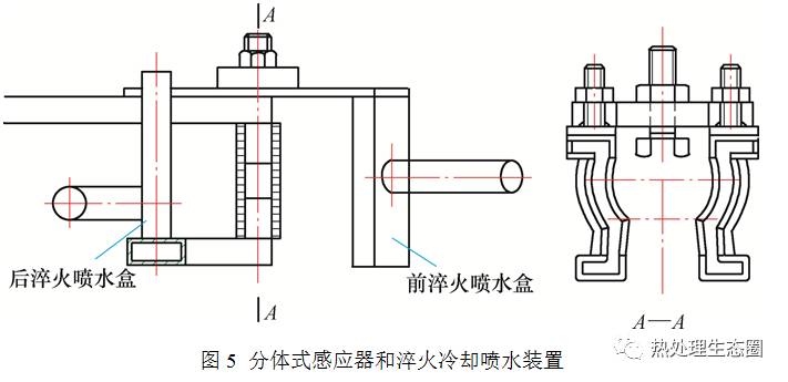 新設計的的感應器和淬火冷卻噴水裝置采用分體結構(見圖5),左側為總成裝配的感應器和淬火冷卻噴水裝置,右側A-A剖視圖為感應器和工件上定位裝置,感應器的形狀保證了感應器有效圈內側和工件間的間隙的均勻性,工件放入下置的裝夾機構,移入感應器內,調整行程至中間位置,用上定位裝置固定,然后下置的裝夾機構帶動球頭銷旋轉,感應器通電加熱部品,加熱完成后由前后淬火噴水盒噴水冷卻淬火,噴水停止后下置的裝夾機構移出,取出球頭銷,再裝夾未淬火的球頭銷重復上述過程,完成淬火后的球頭銷入回火爐回火。