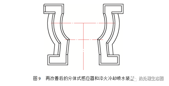 硬化層形狀主要取決于感應器的結構形狀,感應器與被加熱部品之間的間隙越均勻越有利于硬化層的均勻,既硬化層形狀越好,但當部品形狀復雜時,還要考慮感應加熱特有的“尖角效應”。另外,本感應器的加熱和淬火冷卻噴水圈為一體化設計,因此在對感應器有效圈的形狀設計時考慮了部品的放入和取出問題,導致該感應器的形狀設計成如圖3所示的結構,而要改善圖4所示的硬化層形狀不良,只能從根本上改變感應器的結構和淬火冷卻噴水圈的結構,為此我們需要重新設計感應器和淬火冷卻噴水裝置。