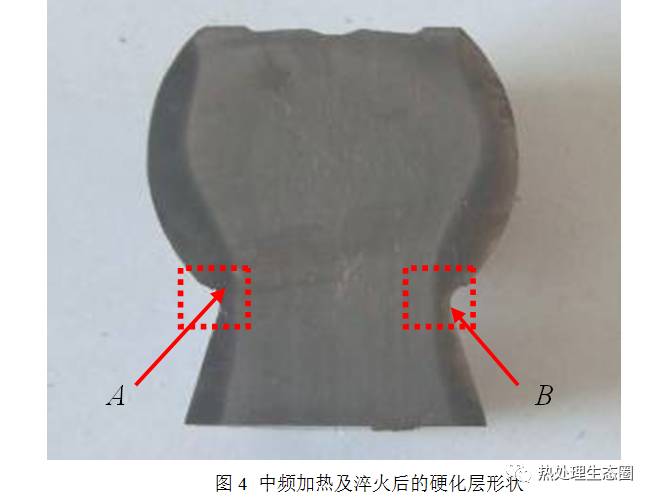使用上述中頻感應熱處理工藝加工出來的球頭銷,經檢驗確認:硬度、馬氏體組織、硬化層深度、硬化區域及形狀都合格,符合技術要求,但如圖4所示的硬化層形狀中,A、B兩處明顯比其他部分層深淺,硬化層深度非常不均勻,對熱處理的穩定性控制帶來了很大的困難,為此我們決定改善此不良現象。
