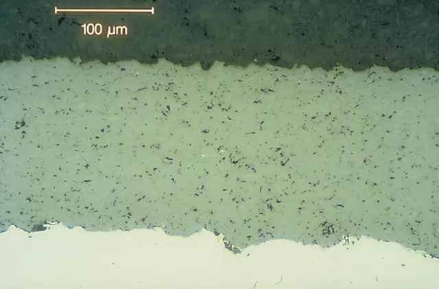 等離子涂層與基板之間的裂縫。裂縫源于切割。放大:500x
