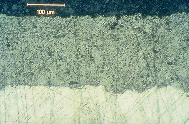 由于 B4C 顆粒與鋁基質(zhì)之間存在輕微起伏,上一步驟的銅沉積樣品的表面。放大:200x