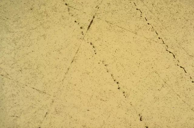 真空下使用環(huán)氧樹(shù)脂鑲嵌的樣品。裂縫 使用熒光染料填充,從而證明該 裂縫在鑲樣之前已存在于材料中。放大:500x