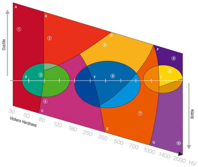 依據(jù)材料的韌性向下或向上查,與硬度不同的是,韌性較難以確定其準(zhǔn)確數(shù)值,一般依照個(gè)人的經(jīng)驗(yàn)定出后,在Y軸上找出材料的位置。
