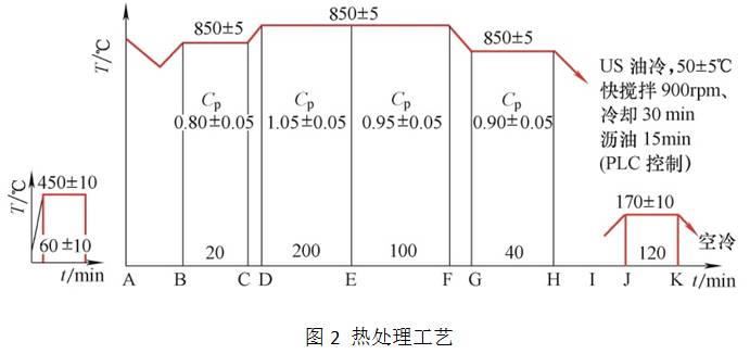 制定滲碳淬火工藝(見圖2)及技術要求:表面硬度≥660HV;有效硬化層為0.50~0.90mm(含外圓磨量);心部硬度為35~45HRC;表層組織要求齒角碳化物1~3級,齒面馬氏體要求1~5級,殘留奧氏體1~5級;非馬氏體層≤0.02mm。