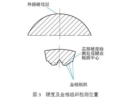 圖樣技術要求中規定了材料,即AISI 4140(相當于國產42CrMo)以及“具體”的熱處理工藝,即調質+感應淬火:加熱到845℃并保溫1h→油淬后檢測,淬火態硬度58~62HRC→300℃回火時間1h→冷卻至室溫,硬度40~45HRC;一次性感應淬火→180℃回火1h→冷卻至室溫檢測→表面硬度58~62HRC,心部硬度40~45HRC→有效硬化層深度0.4~0.8mm。
