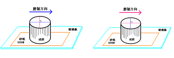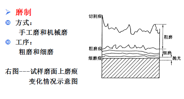 ?磨制方法l砂紙平鋪在玻璃板上,一手按住砂紙,另一手握住試樣,使試樣磨面朝下并與砂紙接觸,在輕微壓力作用下向前推行磨制。l磨制以“單程單向”方式重復進行。l在調換下一號更細的砂紙時,應將試樣上的磨屑和砂粒清除干凈,并使試樣的磨制方向調轉90°