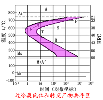實際生產中,奧氏體冷卻速度較快,必須過冷到A1溫度以下才開始轉變。在相變溫度A1以下還沒有發(fā)生轉變而處于不穩(wěn)定狀態(tài)的奧氏體稱過冷奧氏體。
